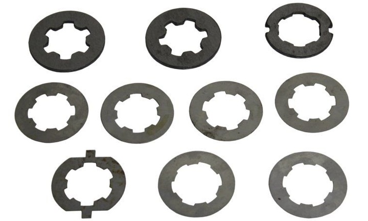 Komplet metalowych podkładek rewersu przeznaczony do ciągników rolniczych Władimirec T-25. Elementy zapewniają prawidłowe działanie mechanizmu rewersu, stabilizując jego pracę i zwiększając trwałość przekładni.